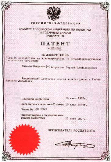 № 2081637 от 25.06.96 г. на изобретение "Способ воздействия на психиатрические и психоневрологические способности организма";