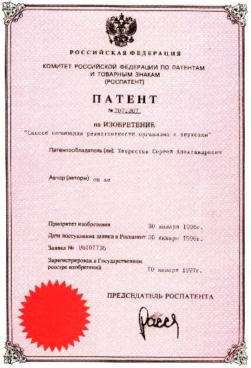 № 2081636 от 25.06.96 г. на изобретение "Способ коррекции параметров иммунитета";