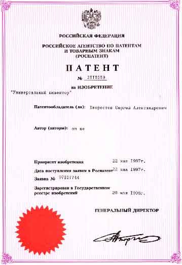 № 2111019 от 22.05.97 г. на изобретение "Универсальный инъектор";