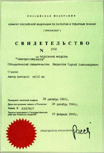 № 1632 от 27.03.95 г. на полезную модель "Электростимулятор";