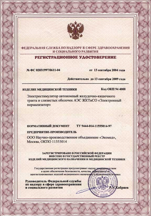 Регистрационное удостоверение Федеральной службы по надзору в сфере здравоохранения и социального развития на Электростимулятор автономный желудочно-кишечного тракта и слизистых оболочек АЭС ЖКТиСО "Электронный нормализатор"
